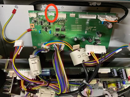 On older model CS200-TS machines it can also be a loose RS232, 9 pin connector at the back of the Console/Touchscreen display assembly. Please see below for depictions of where these issues can occur.